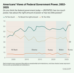 encuesta de Gallup diferente ilustra: un número récord de nosotros creemos que el gobierno federal tiene demasiado poder. En la carrera presidencial de 2024, independientemente de lo que se pueda decir sobre Trump y Harris, se superaron constantemente al explicar exactamente cómo iban a apoderarse de cada vez más partes de la vida de los estadounidenses. Irónicamente, el primer partido que se toma en serio las opiniones de los estadounidenses sobre el poder del gobierno federal y permite que la gente siga con sus vidas podría terminar permaneciendo en el cargo más de unos pocos años.