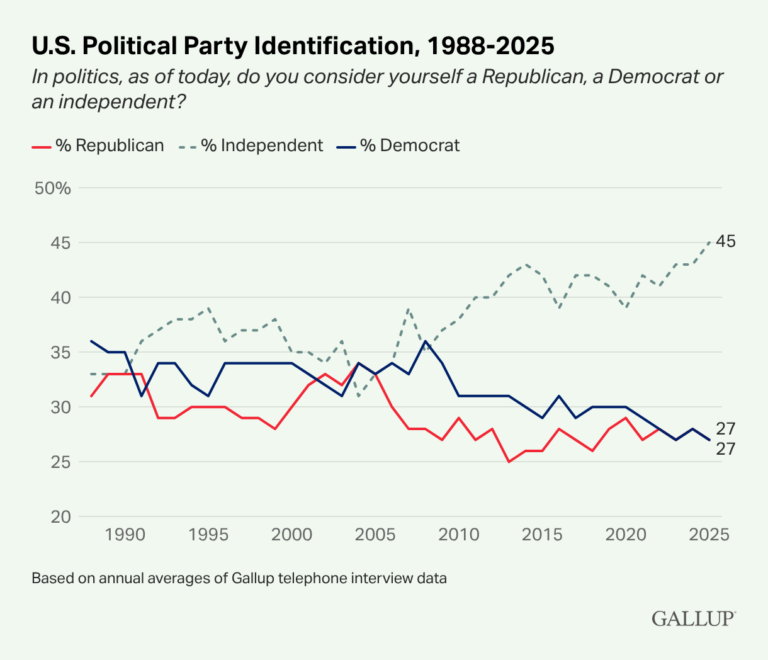 Apenas unas semanas antes de que Donald Trump celebrara el inicio del segundo año de su —posiblemente— último mandato presidencial, Gallup publicó una encuesta realmente impactante sobre cómo se identifican los estadounidenses en términos políticos. Al preguntarles: «¿A día de hoy se considera republicano, demócrata o independiente?», el 45 % se decantó por esta última opción, un récord histórico para una denominación tan atractiva. (Aclaración: soy coautor de un libro titulado » La Declaración de los Independientes «). Mientras tanto, un insignificante 27 % de los encuestados se declaró republicano o demócrata. Esta cifra se acerca mucho al mínimo histórico para los republicanos y representa, hasta la fecha, el punto más bajo para los demócratas.