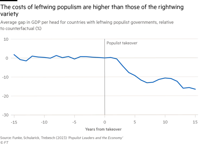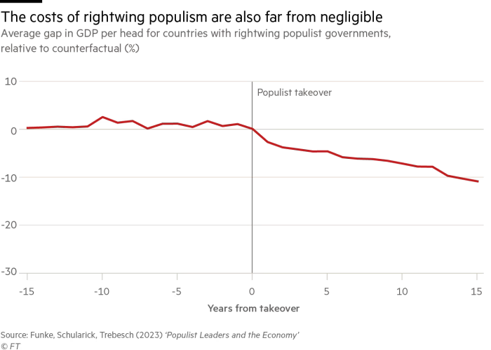 El esclarecedor artículo al que se refiere Suss — “Populist Leaders and the Economy” de Manuel Funke, Moritz Schularick y Christoph Trebesch— se centra en estos efectos económicos. Siguiendo el consenso actual, el artículo afirma que “los populistas sitúan la narrativa de ‘pueblo contra élites’ en el centro de su agenda política y luego afirman ser los únicos representantes del ‘pueblo’”. Por definición, afirman, quienes se oponen a ellos son “enemigos del pueblo”. Puede que los populistas no sean dictadores. Pero, dado que Hitler figura con razón en la lista de este artículo, sin duda pueden serlo.El conjunto de datos del documento cubre 60 países desde 1900 (o independencia) hasta 2020. También representa el 95 por ciento de la producción mundial tanto en 1955 como en 2015, así como 1.482 líderes, algunos más de una vez. Revela varias realidades. En 2018, el populismo alcanzó un pico político. Nuevamente, si un país ha tenido un líder populista una vez, es más probable que tenga otro. Las crisis económicas hacen que el gobierno populista sea más probable. Los populistas también tienden a sobrevivir en el cargo durante un promedio de ocho años, el doble que los no populistas. Crucialmente, pocos populistas salen perdiendo elecciones. Pero los populistas de izquierda y derecha muestran patrones similares de entrada, supervivencia y salida. Finalmente, América Latina y Europa han sido históricamente los dos hogares de la política populista.