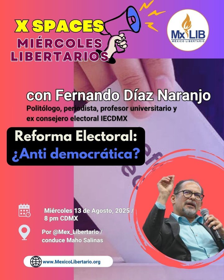 Le invitamos a nuestro próx. Miércoles Libertarios por X Space, con el profesor Fernando Díaz Naranjo, con quien hablaremos de: Reforma Electoral ¿antidemocrática? Con la conducción de María José Salinas.