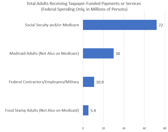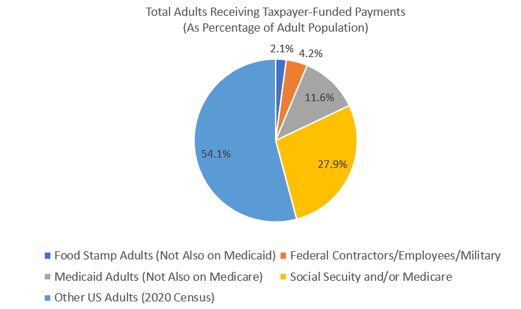 Pero sea cual sea la justificación que den los aproximadamente 117 millones de estadounidenses que viven de la “generosidad” de los contribuyentes, lo cierto es que al menos un tercio de la población de Estados Unidos —casi el 45 % de la población adulta— recibe una gran cantidad de dinero de los contribuyentes. Peor aún, ni siquiera estoy incluyendo aquí a todos los empleados de los gobiernos locales financiados con fondos federales, a los estudiantes y profesores de universidades públicas con fondos federales, ni a los beneficiarios de programas federales menores como el LIHEAP . Y aun así, casi la mitad de la población estadounidense recibe salarios o “prestaciones” financiadas por los contribuyentes.